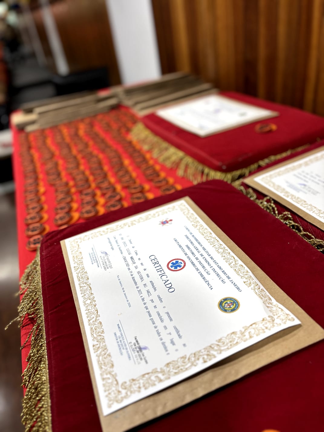 Na sequência, foram entregues os certificados aos primeiros colocados, em reconhecimento ao desempenho e à dedicação demonstrados ao longo da especialização. A formatura simbolizou não apenas a conclusão de um curso, mas o início de uma missão ainda maior: Servir a sociedade com excelência, coragem e elevado preparo técnico. A iniciativa reforça o compromisso permanente do CBMERJ com a qualificação contínua de seu efetivo, refletindo diretamente na excelência do atendimento prestado à sociedade.