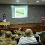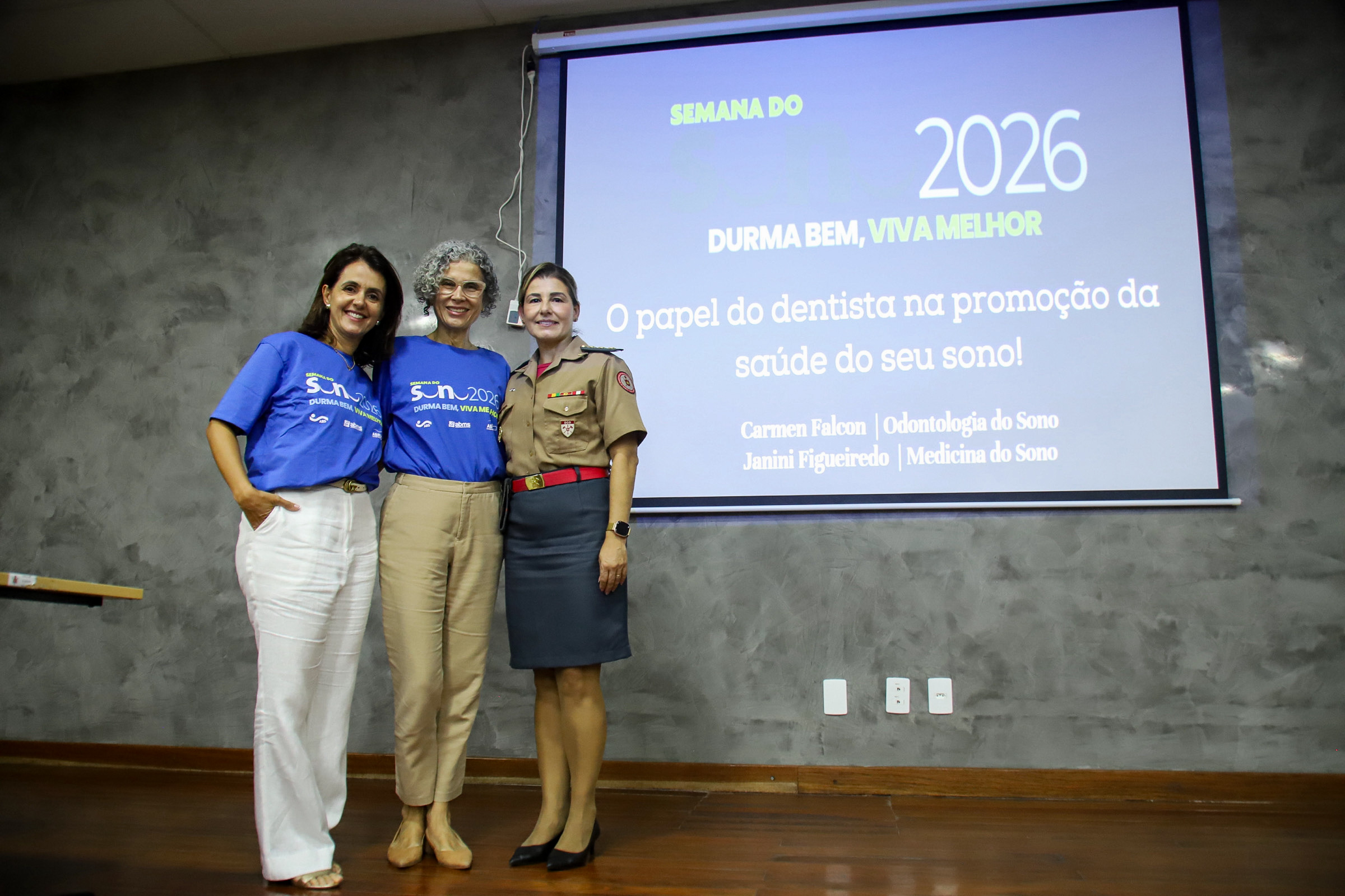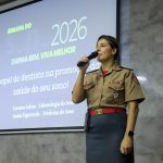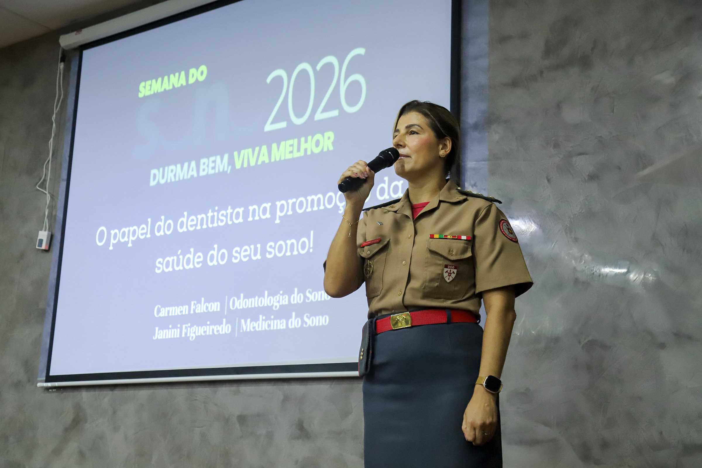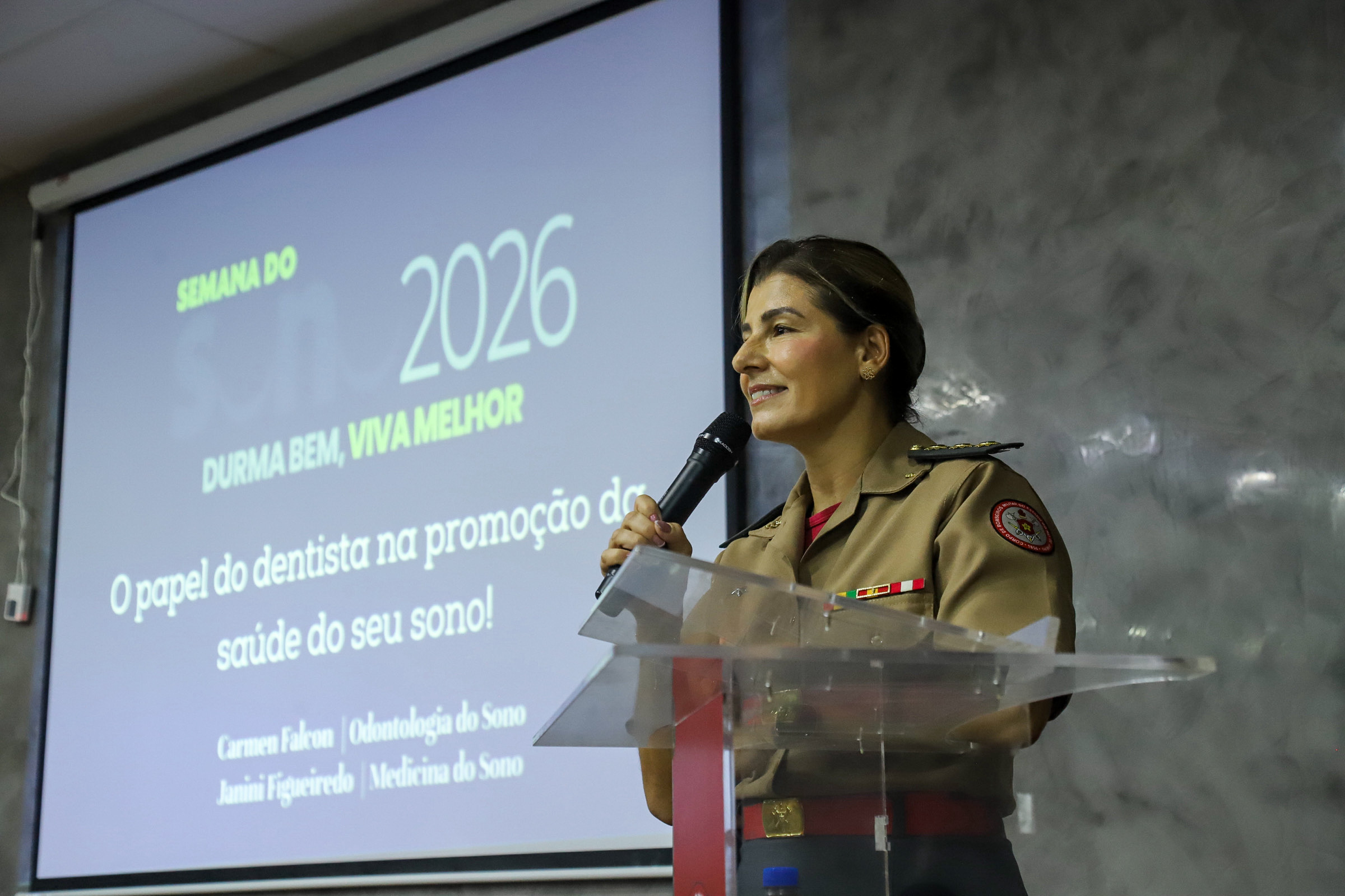 Dando continuidade às apresentações, a Coronel BM Dentista RR Carmem, membro da Associação Brasileira de Odontologia do Sono (ABROS), falou sobre a importância do dentista no diagnóstico e tratamento das alterações na qualidade do sono, apresentando as alternativas de tratamento.